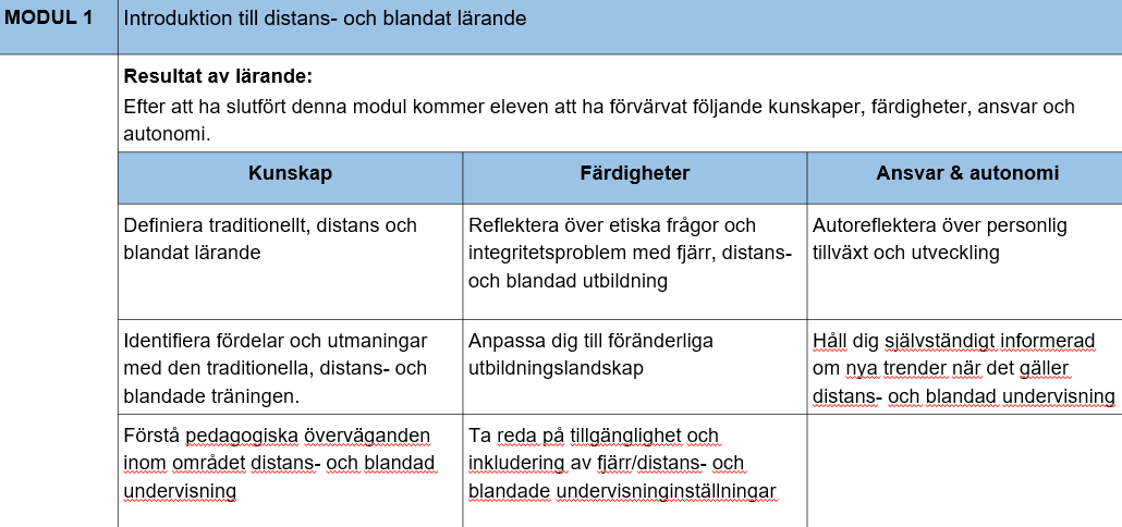 I den här modulen kommer vi att introducera principerna och metoderna för distans- och blandat lärande . Förmågan att designa och leverera effektiv utbildning i dessa format är en värdefull färdighet, och den här modulen kommer att utrusta dig med kunskap, strategier och praktiska verktyg som behövs för att kunna hantera dynamiska lärmiljöer.